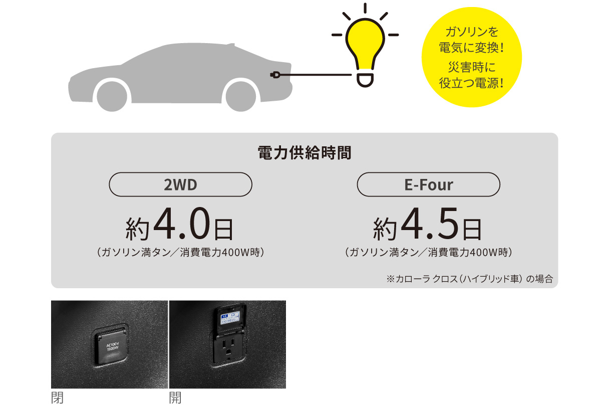 駆動用電池の残量減少などにより、自動でエンジンが始動し、充電を行います。一部の自治体では、駐車または停車中にエンジンを始動した場合、条例にふれる可能性があります。アクセサリーコンセント、非常時給電システムの使用については関係する自治体に確認した上で、適切に使用してください。