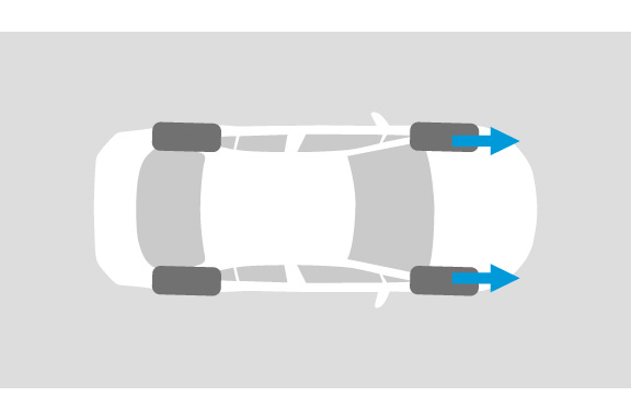 後輪へトルクを配分して、通常の道では発進性をアシスト。滑りやすい道ではタイヤのスリップ量や坂道に応じて最適なトルクを配分し、安定した発進をサポート。